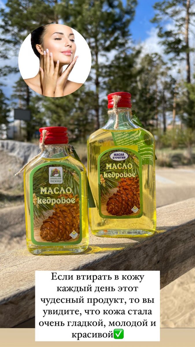 Улучшает состояние волос, ногтей и кожи. Масло кедра содержит в своём составе множество полезных компонентов, достаточное количество в организме которых положительно сказывается на внешнем виде. Кожа становится менее сухой и более эластичной, мелкие морщинки постепенно разглаживаются, а волосы становятся более густыми и послушными. \n \nВыводит скопившиеся отложения из кишечника. Дело в том, что токсичные вещества, откладывающиеся на стенках ЖКТ, негативно сказываются на внешнем виде и самочувствии \n \nСнимает стресс, борется с хронической усталостью. Снижает уровень холестерина. \n